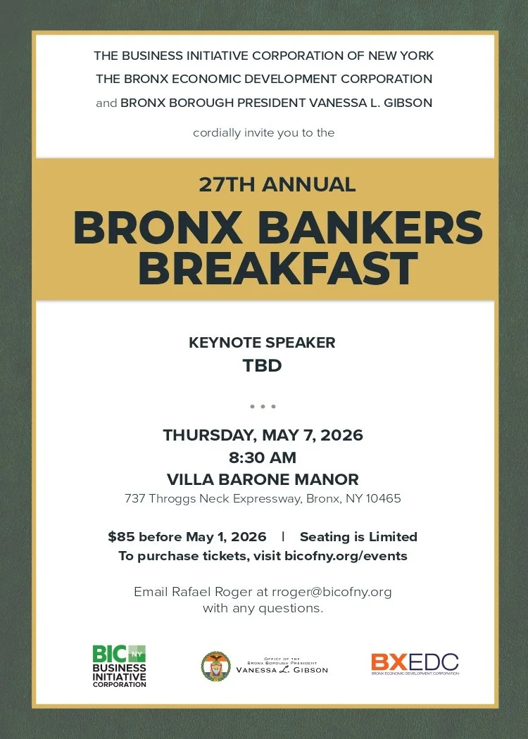 Join us for our Annual Bankers Breakfast, a highly anticipated event that brings together leaders and partners from across the Bronx and beyond. Click below to purchase tickets, explore sponsorship opportunities, and learn more.